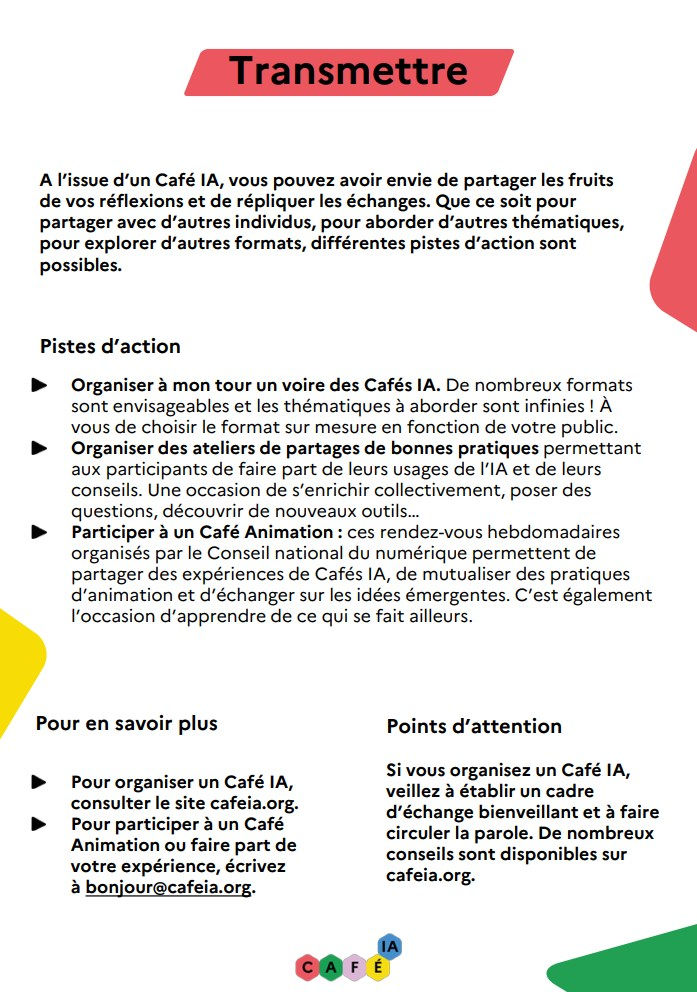 Si vous organisez un Café IA, veillez à établir un cadre d’échange bienveillant et à faire circuler la parole. De nombreux conseils sont disponibles sur cafeia.org.