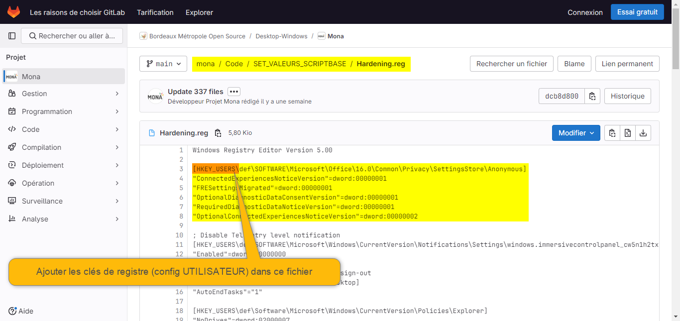 Sur la session utilisateur, faire une capture de la base de registre AVANT modification. Ajouter les codes copieur puis faire une seconde capture. Comparer les 2 captures .reg et identifier les clefs de registre à ajouter au fichier Hardening.reg pour prise en compte par Windows lors de la création du nouveau compte...